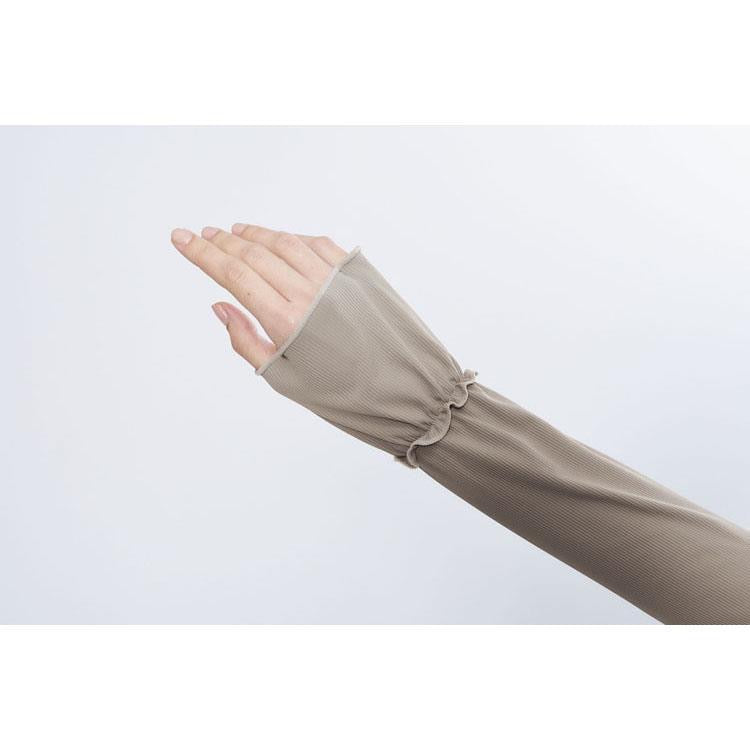 用罗纹材料制作的时尚重叠穿风的臂套。装有橡胶很合身!全长约65cm,通过拇指和小指遮住手背。凉爽舒适,接触冷感加工。UV切割率:深灰色 约97%